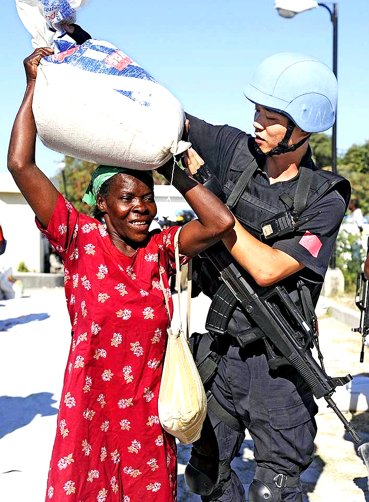 2010 年 2 月 2 日,在海地首都太子港的一个粮食发放点,一名中国赴海地维和警察防暴队队员帮助当地居民领取救济粮食