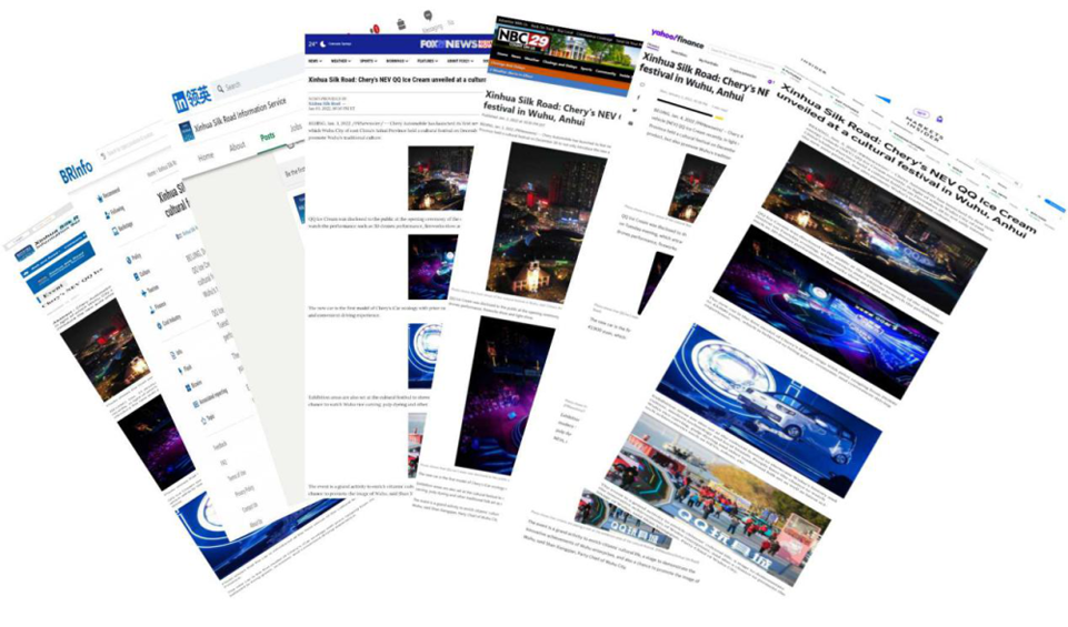 海外信息发布平台“新华丝路”英文网发布题为《Chery's NEV QQ Ice Cream unveiled at a cultural festival in Wuhu, Anhui》的文章,聚焦芜湖“Q乐节”和奇瑞QQ冰淇淋上市,迅速引起海外关注。当地领导、企业代表共同启动芜湖“Q乐节”,正式开启为期七天的Q乐欢乐盛会,借助芜湖的历史文化和现代化快乐元素,向市民展示城市文化底蕴,传递城市动态名片,开启欢乐的城市之旅。