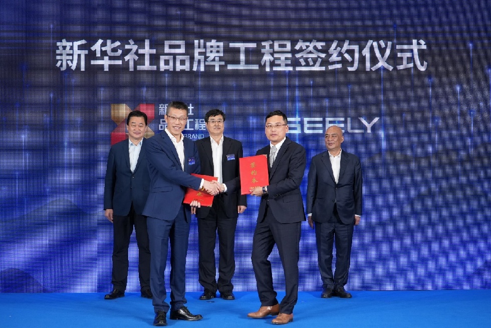 图为中国经济信息社有限公司董事长、总裁徐玉长(前排左)与吉利控股集团品牌传播中心总经理宋兆桓(前排右)交换协议文本