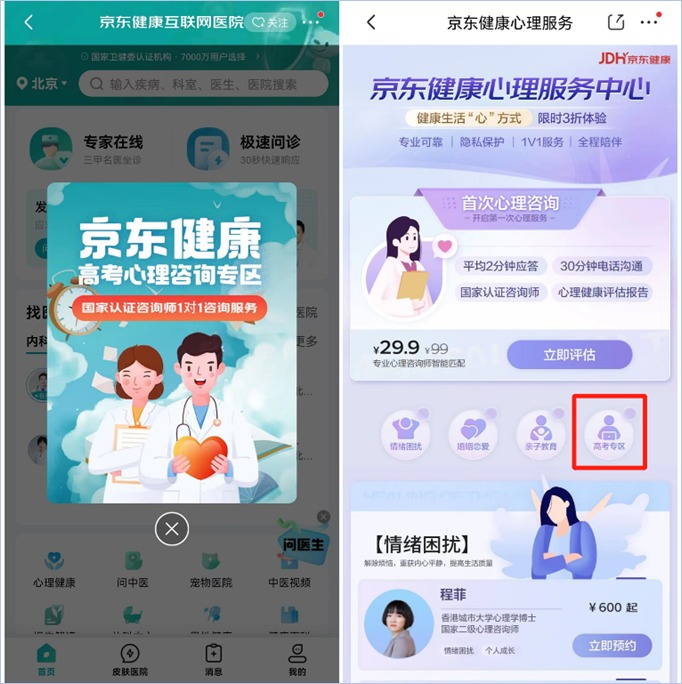 (考生及家长登录京东APP搜索“心理健康”即可进入“高考心理咨询专区”)