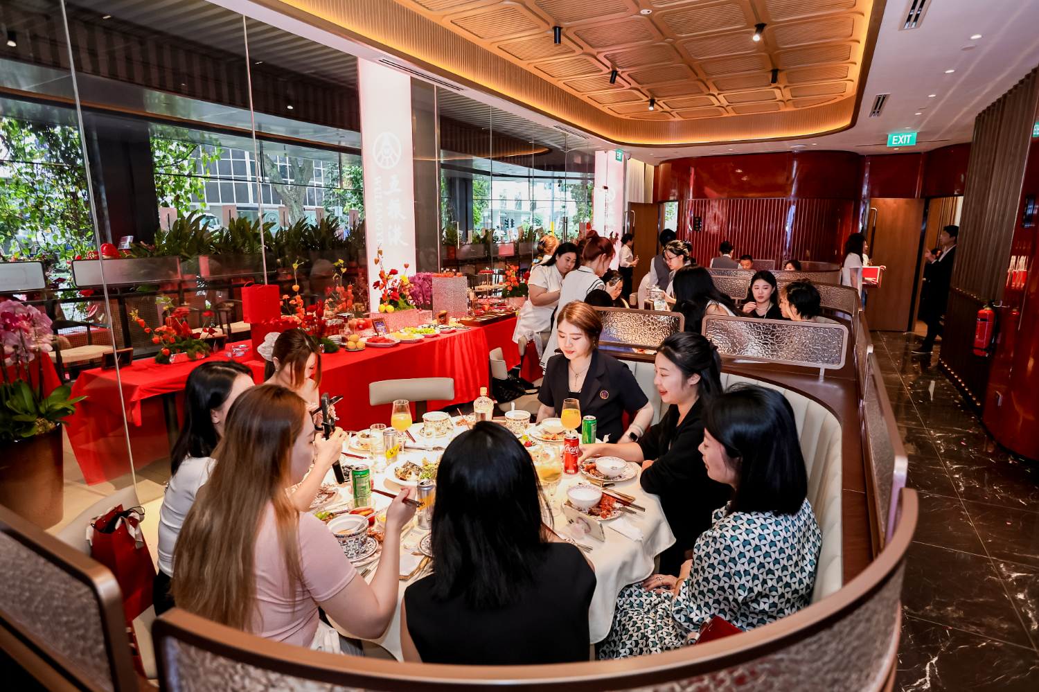 走进位于新加坡中心美食集中地Bugis的新加坡五粮液大酒家,时尚新中式的设计风格令人耳目一新。餐厅以五粮液品牌标准色——红色与金色为主调,融入了中国编制、格栅、龙纹、云纹、木雕等传统文化元素的现代表达,重新定义中式美学空间。入口处,一整面墙的五粮液产品陈列极具视觉冲击力,不仅展现出品牌深厚底蕴和多元风采,更迅速成为顾客热衷的拍照打卡点。