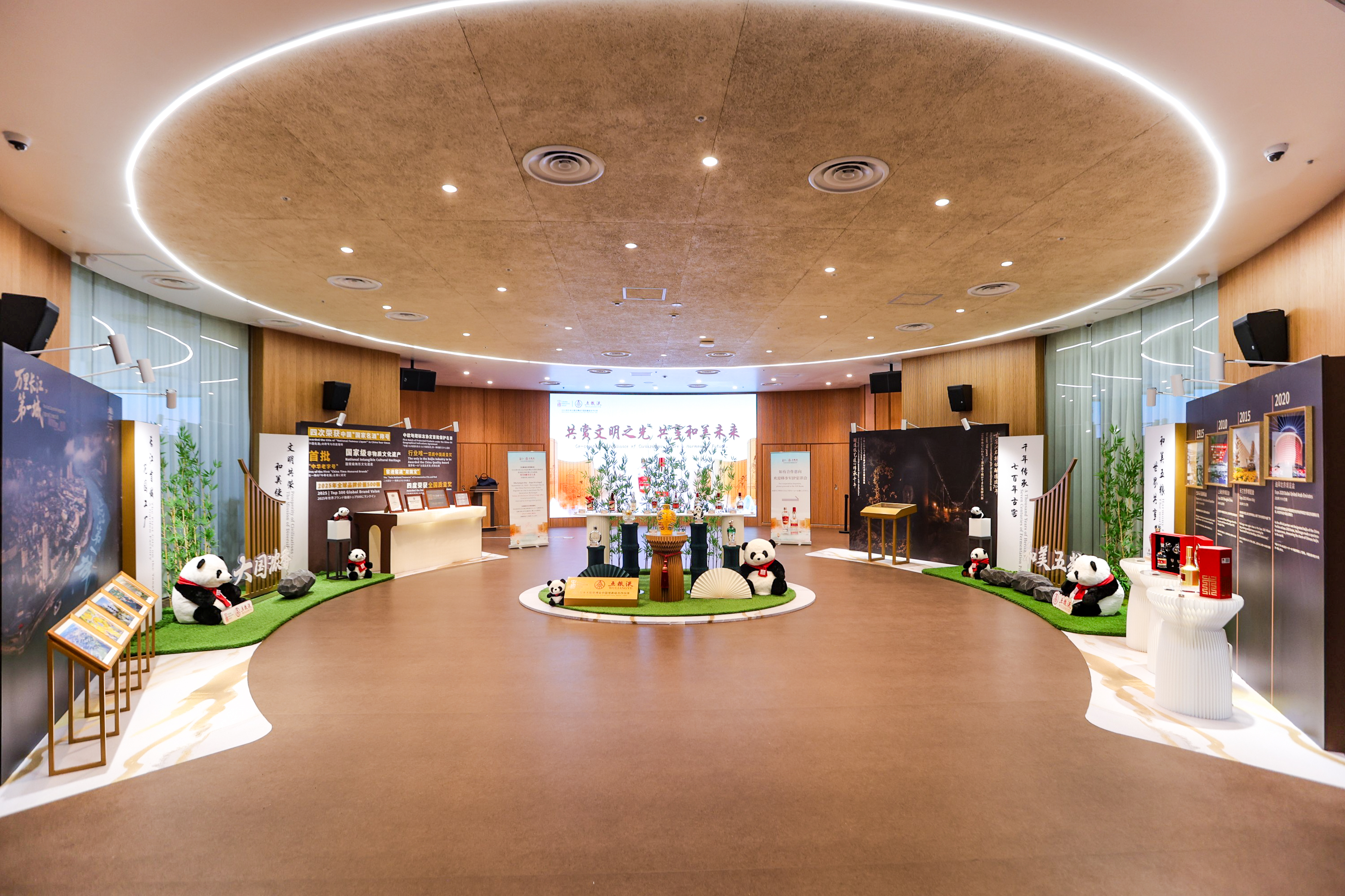 移步核心展示区域,经典五粮液系列集体亮相,第一代至第八代五粮液依次排开,蛇年生肖酒、九龙坛、和美四川酒等特色产品点缀其间,五粮液以产品为载体传递中国白酒文化。荣誉墙上记录着五粮液四次荣获中国“国家名酒”称号、斩获全国质量奖,入选国家级非物质文化遗产、首批“中华老字号”、中欧地理标志首批保护名录、2025年全球品牌价值500强等荣耀,成为五粮液品质与文化实力的佐证,标注出品牌“从中国认可到闪耀国际”的进阶轨迹。图片矩阵系统呈现五粮液长江首城宜宾的自然生态优势、七百余年古酒坊及千年传承酿艺的酿造优势,“窖池窖泥双国宝”的稀缺价值,让观众近距离感受“天人共酿”的五粮智慧与“和合共生”的价值主张。展馆四周,疏影摇曳的翠竹、憨态可掬的熊猫等四川元素点缀其间,巴蜀的自然之美与人文之韵在国际舞台绽放。