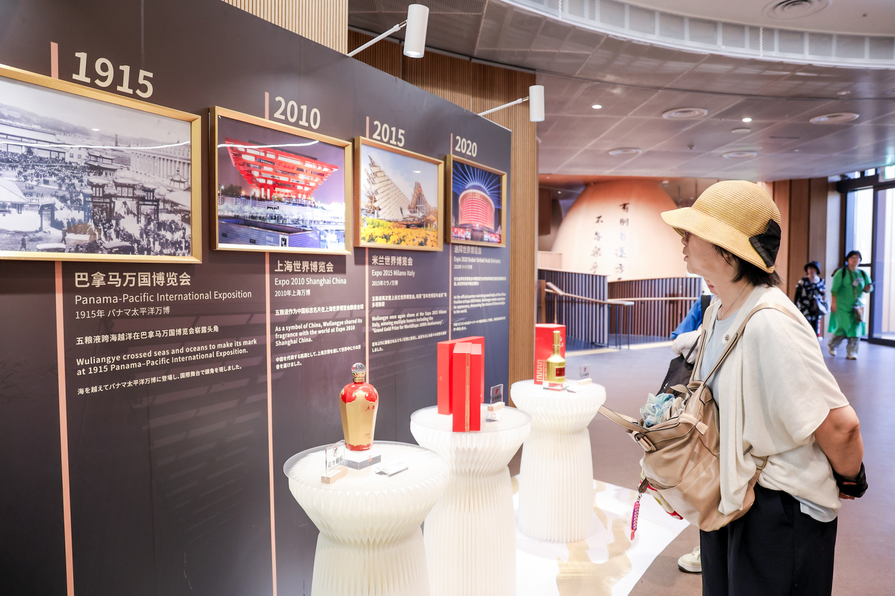 中国馆“五粮液主题日”活动现场,沙画、视频、图片与微缩景观交相辉映,以沉浸式视觉语言勾勒中国品牌的独特魅力。12.98米长的LED环形屏幕成为展陈核心亮点:沙画光影流转间,生动再现了五粮液从1915年巴拿马万国博览会崭露头角,到相继亮相2010年上海世博会、2015年米兰世博会、2020年迪拜世博会的精彩历程,更清晰定格了2025年五粮液成为大阪世博会中国馆高级合作伙伴的重要时刻。一幕幕画面串联起百年来品牌与世博会从早期链接到深度同行的深厚情缘,娓娓道来品牌以世博为窗、持续与世界对话的品牌故事。现场陈列的五粮液·百年世博纪念酒、五粮液·大阪世博会纪念礼盒、五粮液·迪拜世博会纪念酒等,正是这段跨越世纪“世博情缘”的生动见证。