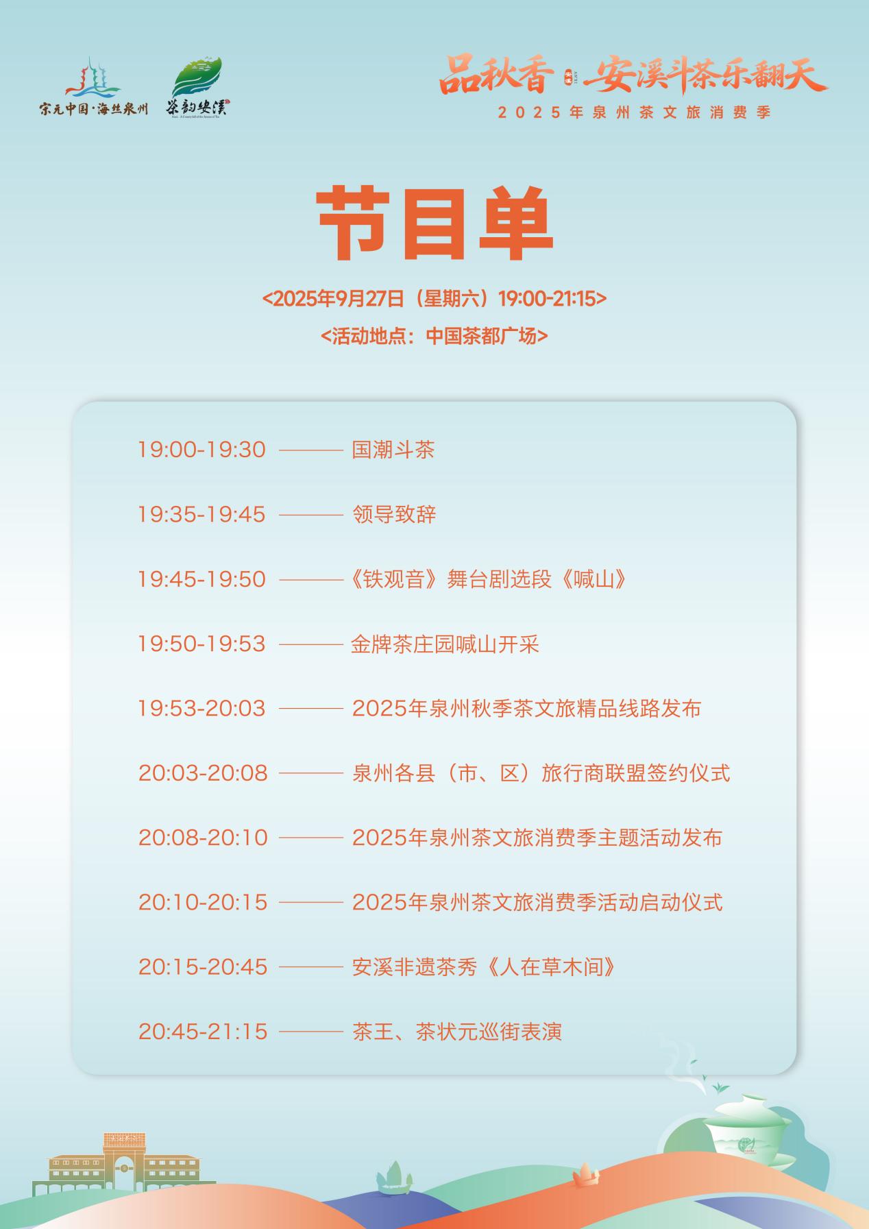 由泉州市文化广电和旅游局、泉州市农业农村局、安溪县人民政府联合主办的“品秋香 安溪斗茶乐翻天”2025年泉州茶文旅消费季,将于9月27日在中国茶都广场隆重拉开帷幕,并持续至12月。这场历时三个月的盛会,不仅是一场茶文化与文旅消费的集中展示,更是推动中华优秀传统文化传承创新、促进文旅深度融合发展的生动实践,是安溪以茶为媒、以旅兴文、以文塑城的崭新篇章。