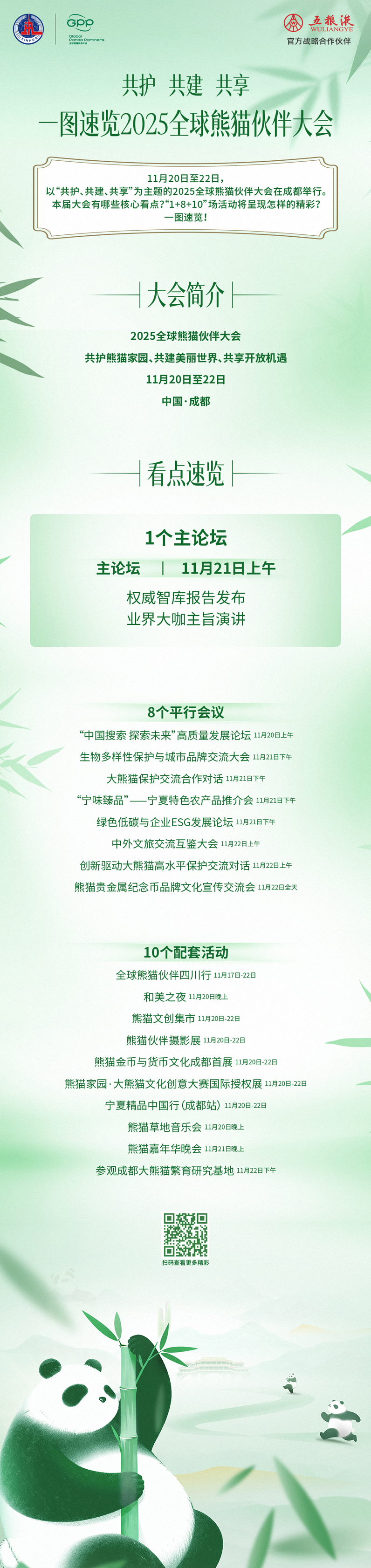 11月20日至22日,以“共护、共建、共享”为主题的2025全球熊猫伙伴大会在成都举行。本届大会有哪些核心看点?“1+8+10”场活动将呈现怎样的精彩?一图速览!
