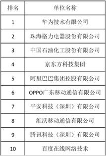 图为2018中国知识产权领域最具影响力创新主体榜单前十