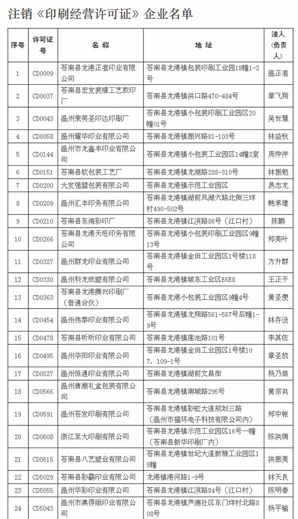 近日,苍南县文化广电新闻出版局发布了关于注销《印刷经营许可证》的通知,该通知简述了苍南县2015年印刷企业年度核验工作情况,并列出116家注销的印刷企业。名单中的企业都存在停产停业(无厂无设备)、擅自移点未办理变更手续(不明去向)、未在规定时间参加年度检验等问题。根据国务院《印刷业管理条例》第三十五、三十七条和浙江省新闻出版局《关于开展2015年全省印刷企业年度核验工作的通知》(浙新发[2014]271号)规定及部分企业的申请,经研究,决定对苍南县龙港正者印业有限公司等116家印刷企业予以注销。