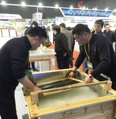尽管现在的印刷主体已经不再局限于纸张,但是在中华文明的传承史上,纸张始终扮演着极其重要的角色。所以,这次广陵古籍刻印社的现场演示,就是从造纸开始的。特制的水槽中,承载有1吨多的水,混合着从安徽泾县引进的纸浆,配以一定比例的胶水,经过充分的搅拌,就形成了制纸的原料。工作人员用网帘在水中沉浸,打捞上来时,就在帘上覆盖了一层纸浆,经过烘干处理,一张质量上好的宣纸就制作成功了。因为是特制的网帘,所以宣纸制好后,纸上就浮现有“广陵古籍刻印社”的字样。
