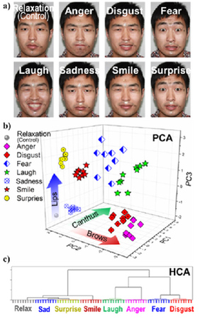 在以上研究基础上,他们突破传统印刷技术中模板和精度的局限,利用微米柱阵列作为“印版”,与含有纳米颗粒的“油墨”及柔性基材构筑了类似传统印刷过程中“印版、油墨和纸张”的三明治结构。随着溶剂的挥发,气-液-固三相接触线有序收缩,纳米颗粒在基材上组装形成周期与振幅精确可控的微米乃至纳米尺度的导电曲线阵列,进而得到对微小形变有灵敏电阻响应的传感器(图1)。将传感器贴在被监测者的皮肤上进行数据采集与分析,可以实时监测不同环境和心理条件下人体体表微形变的相关生理反应,如复杂表情识别(图2),并有望应用于脉搏监测、心脏监护和远程操控等领域。这种高精度、高灵敏传感器的印刷制造方法突破了传统印刷技术的精度极限,将有力推动印刷制造可穿戴电子和其它微纳米功能器件的发展和应用。该研究成果作为VIP文章发表在近日出版的《先进材料》(Adv. Mater. 2016, 28, 1369-1374)上。