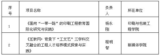 2017年6月,按照《教育部办公厅关于推荐新工科研究与实践项目的通知》的精神,教务处结合学校办学特色和发展方向,遴选了印刷与包装工程学院的《面向“一带一路”的印刷工程教育国际化研究与实践》和新媒体学院的《互联网+ 背景下“工文艺”三学科交叉融合的工程人才培养模式探索与实践》两个项目,经过专家论证后提交到上级部门。在教育部组织的评议中,共认定612个项目为国家级新工科研究与实践项目,学校推荐的两个项目均成功入选。