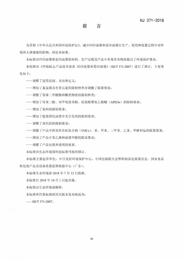 为贯彻《中华人民共和国环境保护法》,减少凹印油墨和柔印油墨在生产、使用和处置过程中对环境和人体健康的影响,生态环境部制定发布《环境标志产品技术要求 凹印油墨和柔印油墨》(HJ 371-2018)(全文附后),本标准对凹印油墨和柔印油墨原材料、生产过程及产品中有毒有害物质提出了环境保护要求,于2018年10月1日起实施。