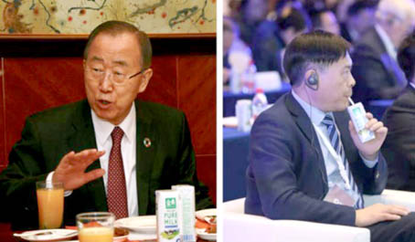 ↑金典新西兰纯牛奶成为第二届国际展望大会唯一指定牛奶(左图为大会嘉宾、联合国第8任秘书长、博鳌亚洲论坛理事长潘基文,右图为大会嘉宾现场品尝金典新西兰纯牛奶)